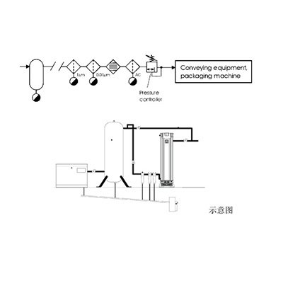 要在儲氣罐后安裝英國WALKER三級壓縮空氣過濾器,使得過濾后的壓縮空氣符合ISO 8573-1:2000顆粒等級的1級標準,固體顆粒小于0.01μm,含油等級也為1級標準,最大含油量0.003mg/m3;壓縮空氣干燥,要在SRA三級壓縮空氣過濾器后加裝SR模塊化吸干機?,這種吸干機是英國制造的無熱吸附式干燥機,利用變壓吸附原理實現壓縮空氣的干燥,一般壓力露點可以達到-40℃,更高的壓力露點為