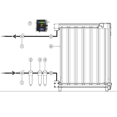 先在車間入口集中處理,按照滿負荷40人計算,每人需要0.3Nm3/min計算,總計需要壓縮空氣12Nm3/min。系統設計能力入口流量是15.58Nm3/min,出口流量大于13.5Nm3,壓力7bar,壓力露點為-40℃。處理后