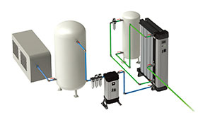 NANO GEN2高純度制氮機根據變壓吸附原理(PSA)從潔凈的壓縮空氣中持續分離出氮氣。兩排成對的裝滿碳分子篩(CMS)的壓鑄鋁筒通過上下的均氣上蓋和底座連成整體,形成一個雙套分離系統